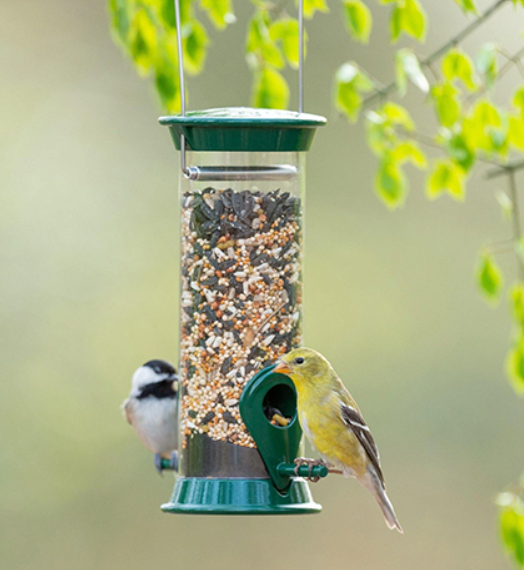 The sliding top is snug enough to make it hard for squirrels to get into, but super easy for humans to fill. Simply slide the die-cast metal cap up the hanger.
